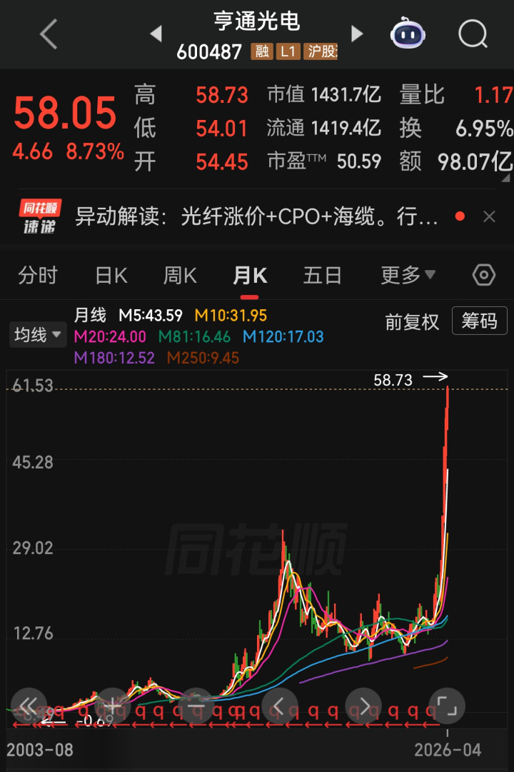 最近A股光纤板块彻底火了,核心原因就是一个——光纤涨价!而且不是小涨,是翻着倍的暴涨。普通单模光纤从去年底的20块左右,直接飙到现在80多块,最高涨幅超4倍。在这场超级景气周期里,两只龙头股彻底起飞:长飞光纤一年内涨了10倍,不断刷新历史新高;亨通光电也不甘落后,半年翻倍,同样走出持续新高行情。两家公司都被机构资金疯狂追捧,成为市场焦点。很多股民都在问:同样是光纤龙头,同样在涨价潮里赚得盆满钵满,长飞光纤和亨通光电到底谁潜力更大?谁更有龙头风范?两家优势又有啥不同? 今天我们就来好好的捋一捋。
